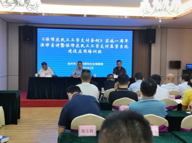 为贯彻落实《保障农民工工资支付条例》精神,全力做好迎检考核工作,压紧压实在建项目“一金五制”落实,9月2日至3日,我市《保障农民工工资支付条例》实施一周年法律宣讲暨保障农民工工资支付监管系统建设应用培训班在池州市迎宾馆顺利举办。各县(区)人社、住建、交通运输、水利等部门分管负责同志和劳动保障监察机构负责同志,市根治拖欠农民工工资工作领导小组部分成员单位,全市建设领域部分在建项目总承包企业负责人及劳资专管员等110余人参加了此次培训。