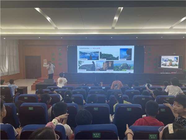 一是科普讲座。在九华山风景区中心学校多媒体教室内,邀请九华山地质公园专家章寅虎作了“九华山世界地质公园科普进校园”主题讲座,向同学们详细的介绍了九华山的地质地貌、地质遗迹和重要的生态、人文景观等,与学生们积极互动。几番交流,学生们都收获满满,直观生动的了解了九华山的地质剖面、地质构造、地貌景观与水体景观等内容,认识到了九华山世界地质公园的科研价值与保护价值。