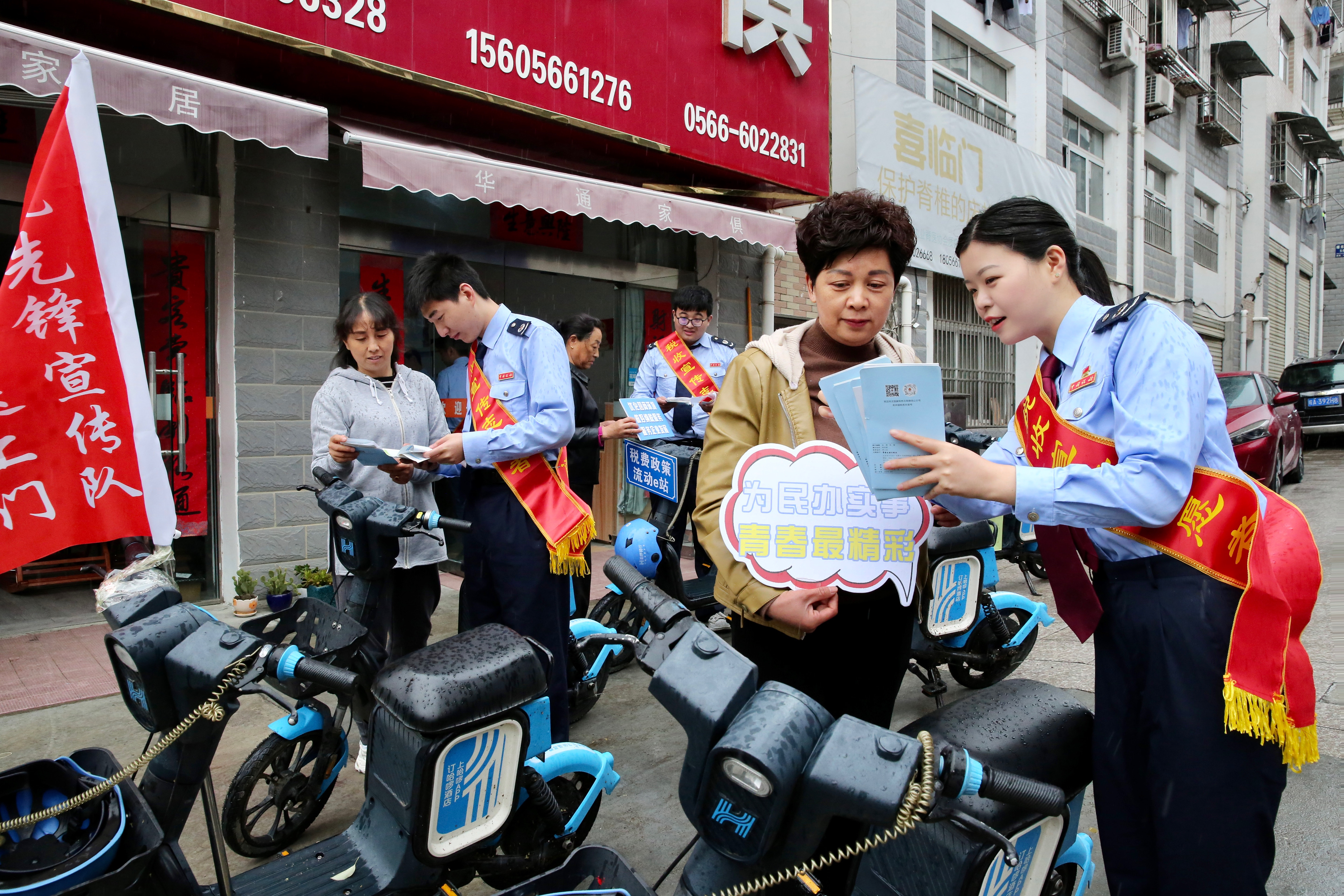 活动中,“青税先锋”宣传骑行队,身披绶带、车挂标语,带着税费政策“大礼包”,乘着税宣“春风”穿过秋浦河畔,向途经商户和过往群众发放宣传资料,接受涉税咨询,并通过现场演示扫码、申报、缴费全流程等方式耐心讲解个人所得税年度汇算、社保费缴纳等政策热点。