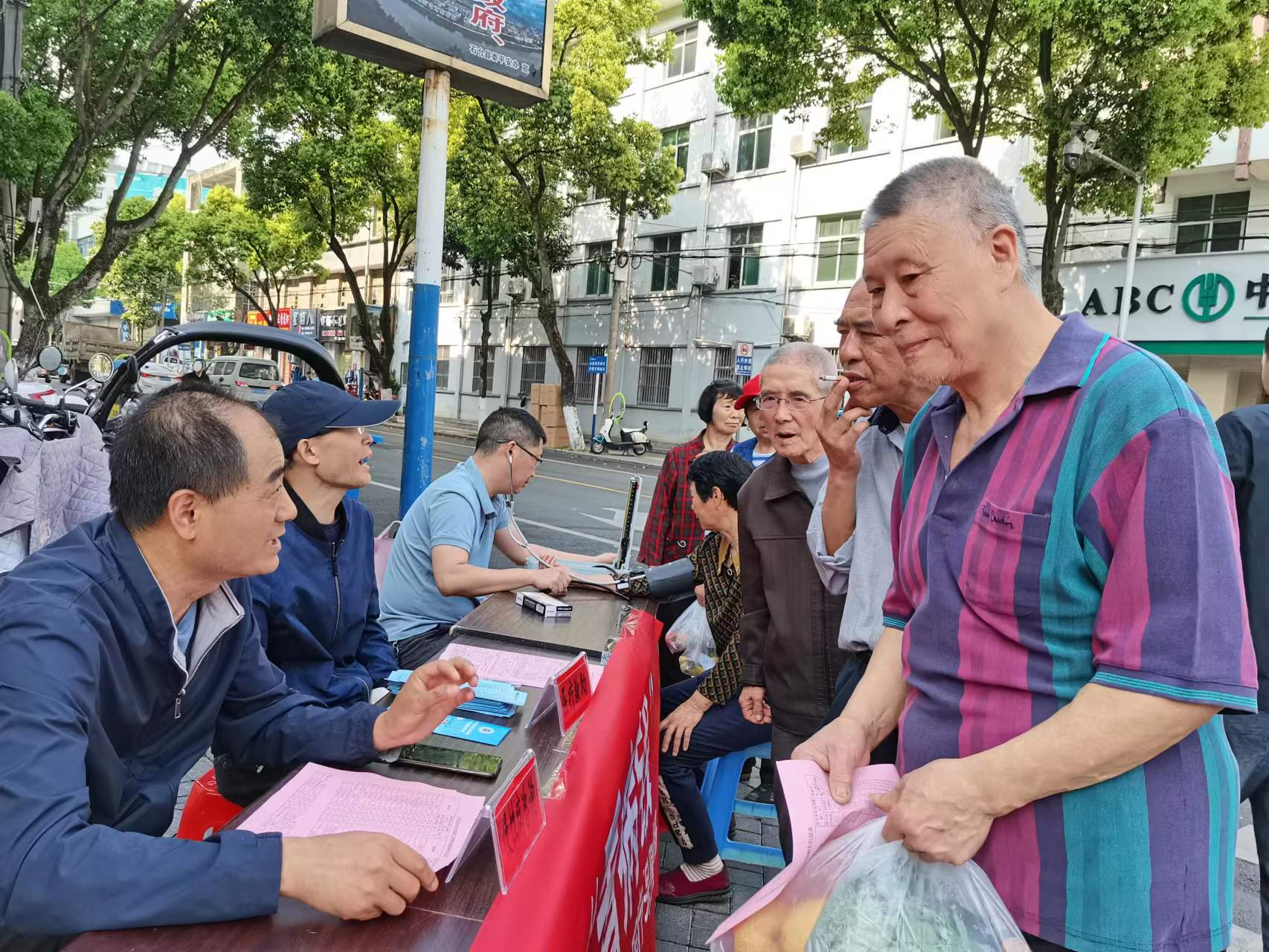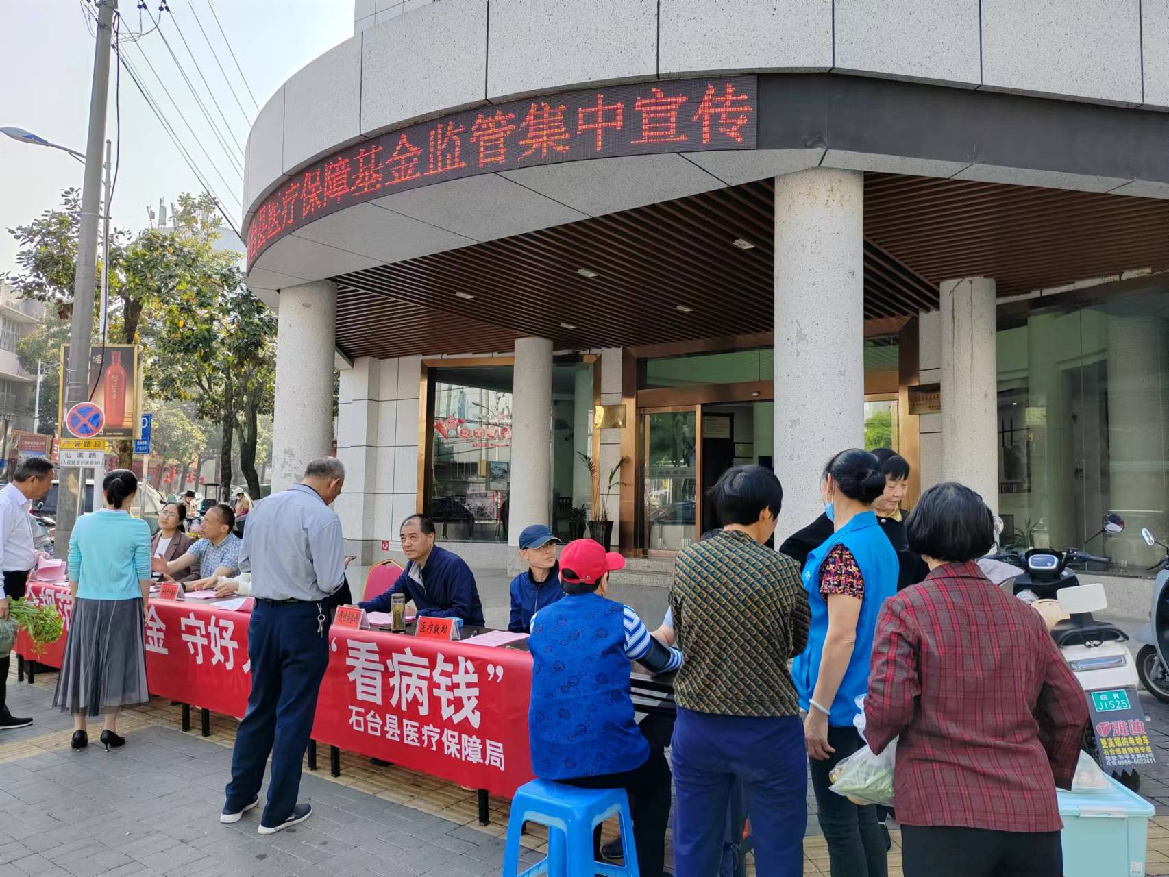 线下宣传造氛围。送法进医疗机构。发动各定点医药机构利用电子显示屏滚动播放基金监管宣传口号,印制《安徽省违法违规使用医疗保障基金举报奖励办法》《石台县城乡居民异地就医、转诊转院政策情况表》《致石台县城乡居民的一封信》。同时走进乡镇卫生院召开两定机构负责人医保政策法规培训会、签订医保基金监管信用承诺书、与会人员沟通交流。送法进社区、街道,4月20日,在主城区街道开展现场宣传活动,设立咨询台、摆放宣传展板、发放宣传资料、义诊,为民服务零距离。