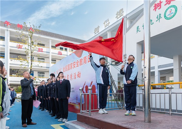 在学校,围绕“升国旗、唱国歌”“国旗下宣誓”“国旗下签名”“国家安全教育宣传片”等内容开展“全民国家安全教育日”进校园系列主题活动。