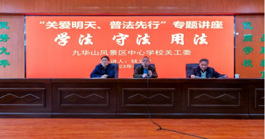 为加强校园法治教育,丰富学生的法律知识,提高其自我保护能力,让学生学法、懂法、守法、用法,增强学生的法律观念,自觉遵纪守法,4月4日下午,九华山风景区中心学校关工委邀请退休老教师“五老”报告团成员钱义贵为我校五六年级师生带来一场“法治宣传教育”专题讲座。