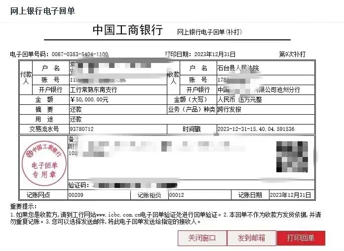 2023年最后一天正值元旦假期期间,同样也是2笔调解案款履行的最后期限。石台法院民庭干警清楚地记得这件事,承办人在当天再次微信联系当事人,提醒付款时间届至,应按调解协议约定及时履行付款义务,否则将承担不利法律后果。当事人一开始并不配合,一再诉说自己当前经济困难,难以付款。承办人耐心释法明理,继续跟进督促履行。12月31日下午,承办人看到2位当事人发来的付款记录时心才安定下来。