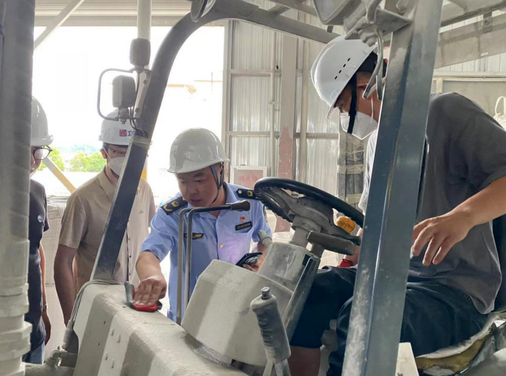 此次行动主要针对辖区内的叉车使用单位。执法人员进入企业,突击检查了叉车工况,对其转向灯、喇叭、安全带、刹车灯等基本部件进行了全面排查。执法人员还调取了叉车检验报告、维保记录等,并指导使用单位进一步落实“两个责任”。