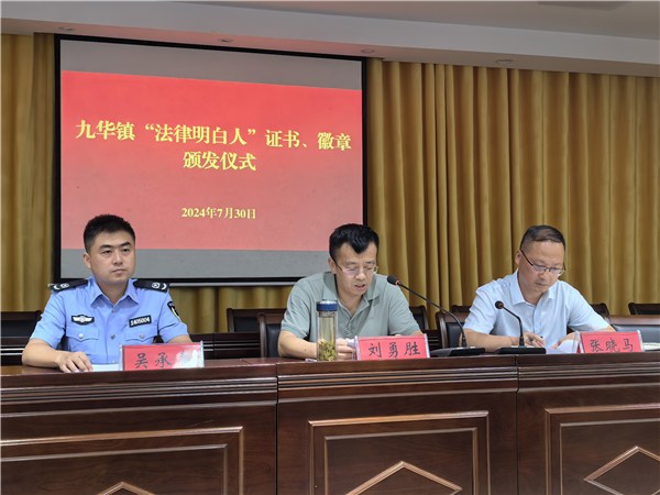 开训前,首先宣读了《九华山风景区司法局关于任命姜飞等55名“法律明白人”的通知》,与会领导为九华镇19名“法律明白人”颁发了证书和徽章。祇民社区姜飞代表“法律明白人”作表态发言。