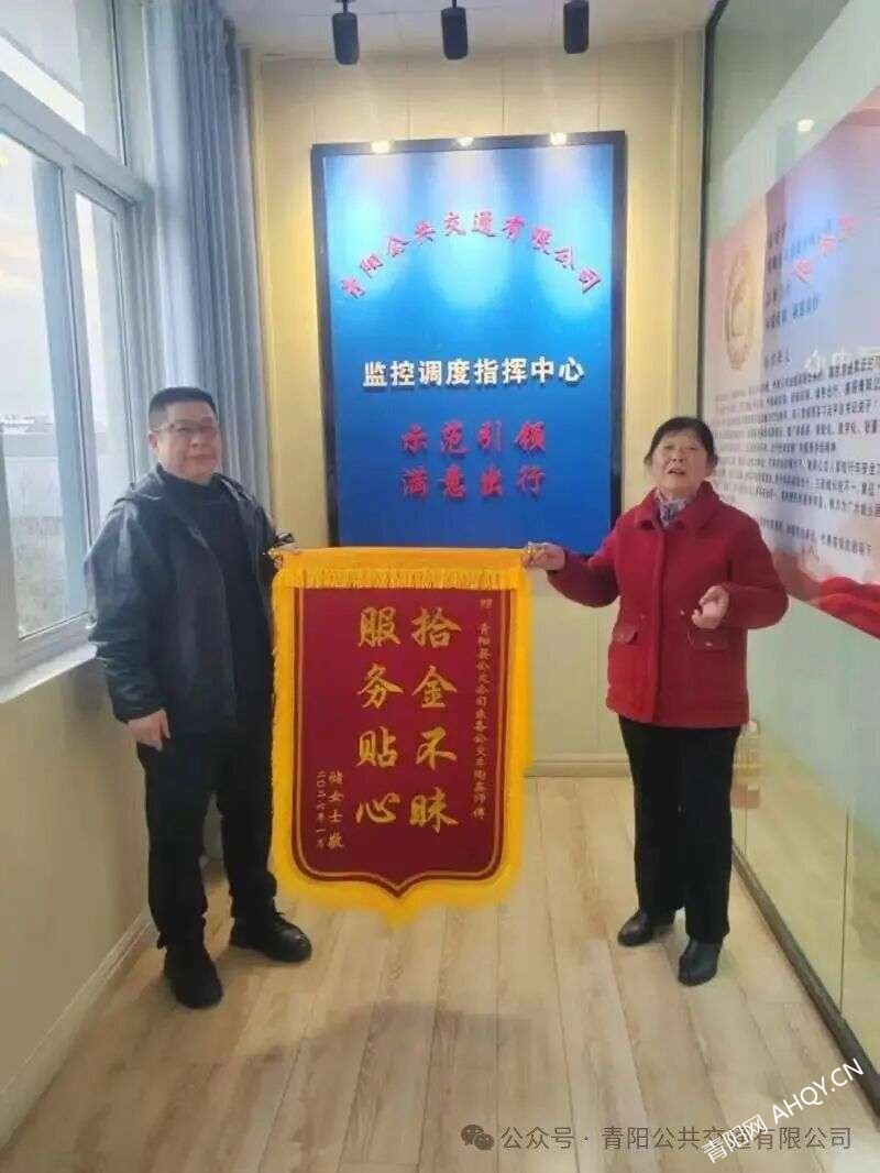 2026年2月8日青阳公共交通有限公司驾驶员陶鑫师傅,用一次拾金不昧的善举,温暖了整个城市的冬日,展现了公交人的责任与担当,传递了满满的社会正能量。2月13日,青阳县公交公司内暖意融融,乘客储女士将一面印有“拾金不昧,服务贴心”的锦旗送到工作人员手中,并再三要求一定要当面向朱备线驾驶员陶鑫师傅致谢。感谢他用实际行动守护了乘客的财物,也温暖了乘客的心。